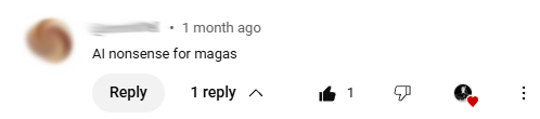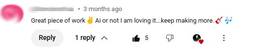 The political comment about magas I had to include because I NEVER get political in my comments at all. This happened to be on a country style song I did. It’s okay, but just showing the range of comments I get. From the ones below, I especially like the ones ‘AI or not I’m loving it’ or ‘I know its AI songs, but its fckn good’! LOL These are listeners who can hear ‘the song’. They hear in it what I hear which is great!